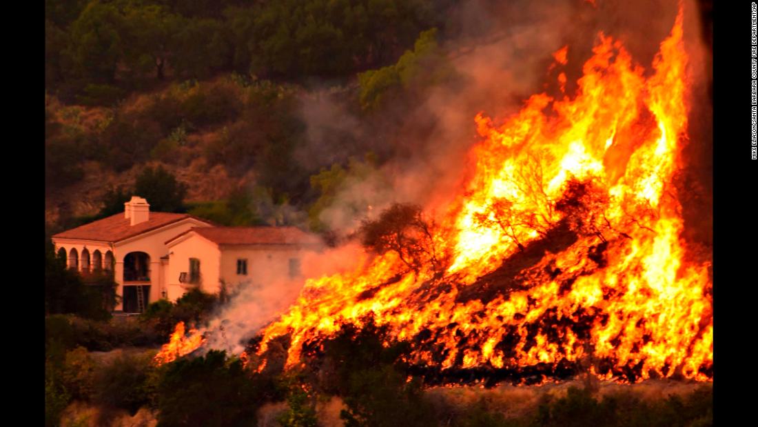 In this Thursday, Dec. 14, 2017, photo provided by the Santa Barbara County Fire Department, flames from a back firing operation underway rise behind a home off Ladera Lane near Bella Vista Drive in Santa Barbara, Calif. Red Flag warnings for the critical combination of low humidity and strong winds expired for a swath of Southern California at midmorning but a new warning was scheduled to go into effect Saturday in the fire area due to the predicted return of winds. The so-called Thomas Fire, the fourth-largest in California history, was 35 percent contained after sweeping across more than 394 square miles (1,020 sq. kilometers) of Ventura and Santa Barbara counties since it erupted Dec. 4 a few miles from Thomas Aquinas College. (Mike Eliason/Santa Barbara County Fire Department via AP)